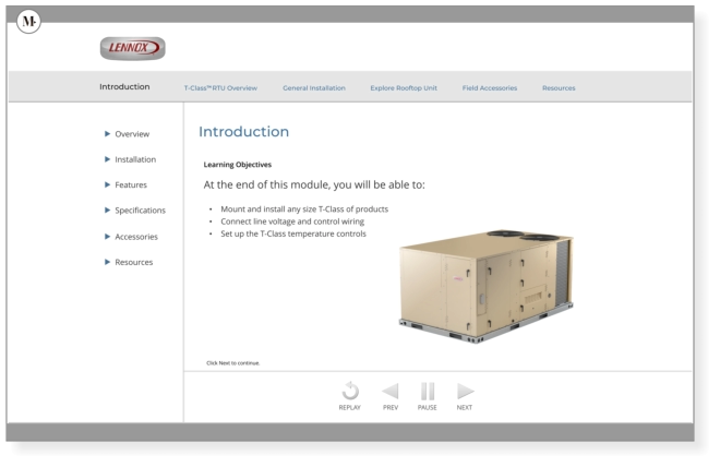 I was one of the creative team leaders in the design and production of instructional media for corporate online courses including the Lennox T-Class e-Learning module screen to the right. The screens have: An industry standard, user friendly layout An easy to use accordion style expandable course directory in a window on the left easily recognizable with users Common controls using standard readable icons to advance ahead or backup through the different sections and control the audio Plenty of space on the right side of the screen for visual aids in the form of photos, illustrations, and animations produced in-house. I was a team leader in those efforts.
