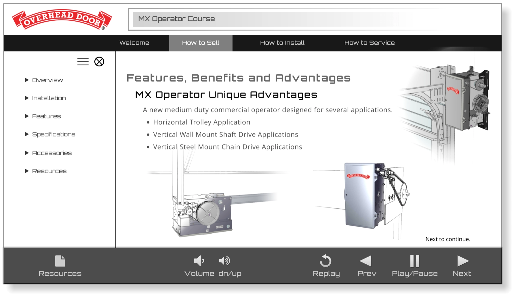 I was the lead designer/illustrator for the Overhead Door MX Operator Series e-learning module. commercial garage door openers. The module won a pier award among other e-learning modules. The style of illustration combining line art and partial shading gave it a unique visual style. Use of Solidworks models rendered as both line art and grayscale shading Combined using Photoshop in separate layers Standard user interface using industry standard layout and simple, recognizable icons to navigate through each section